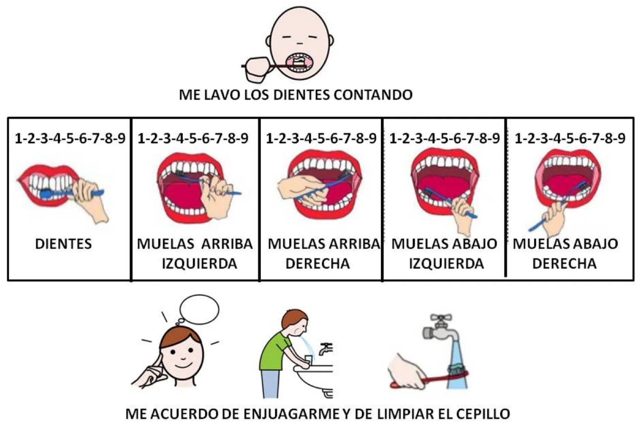 4- Para el lavado de dientes lo mismo, le compramos un cepillo de dientes eléctrico, entonces ella se lava muy rápido. Para eso, encontré en arasaac.org una secuencia que cepillado más detallada y además incluye otro tipo de secuencia de baño (quizás a alguien le pueda servir también). Les dejo aquí el enlace de descarga de ese material: “Lavado de dientes“