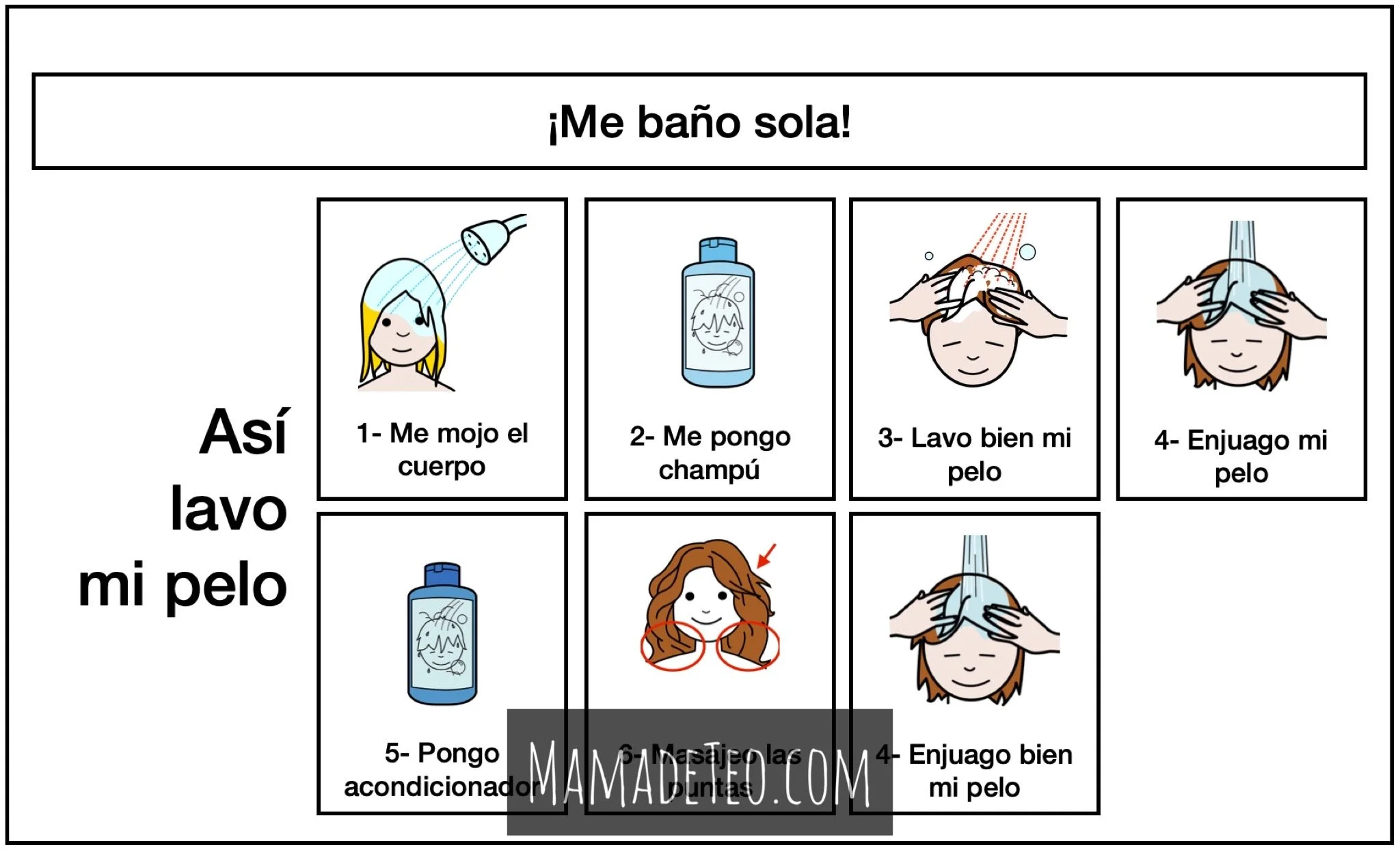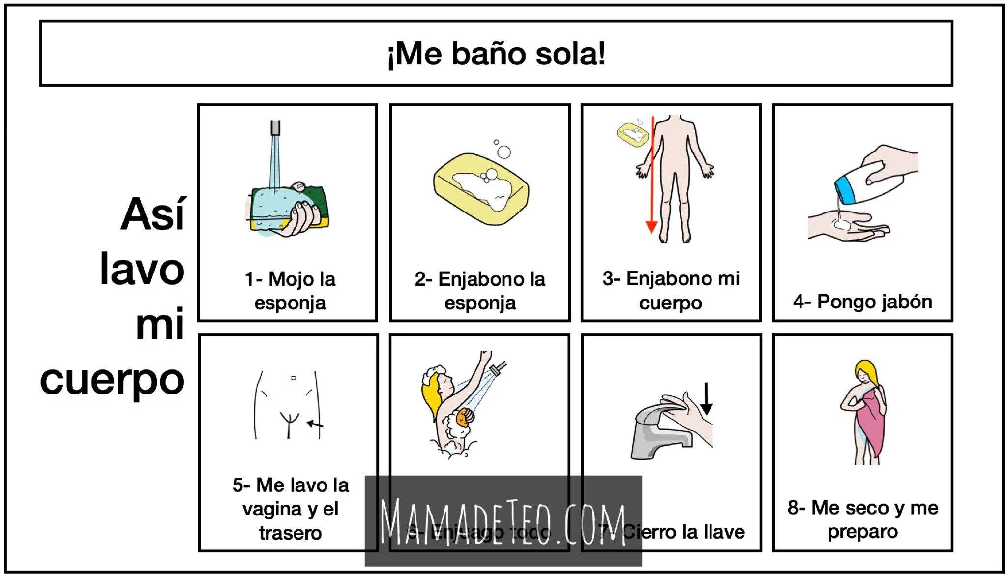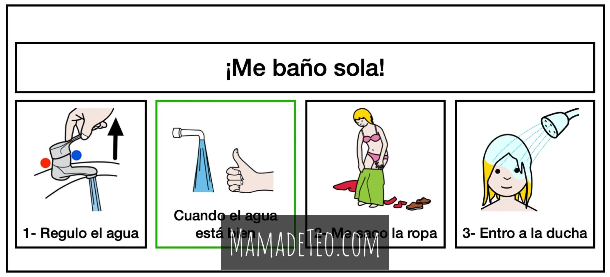 3- Ahora que está más grande, utilizamos mucho los pictogramas para que logre interiorizar la secuencia del baño, desde antes de entrar a la ducha, hasta salir de esta. Sin estos apoyos, Teo juega mucho con el agua, con el jabón, canta (cosa que me encanta!) pero, se olvida de lo que debe hacer. Entonces siguiendo esta secuencia ella sabe los pasos a seguir para ducharse, quedar limpia y enjuagada :)