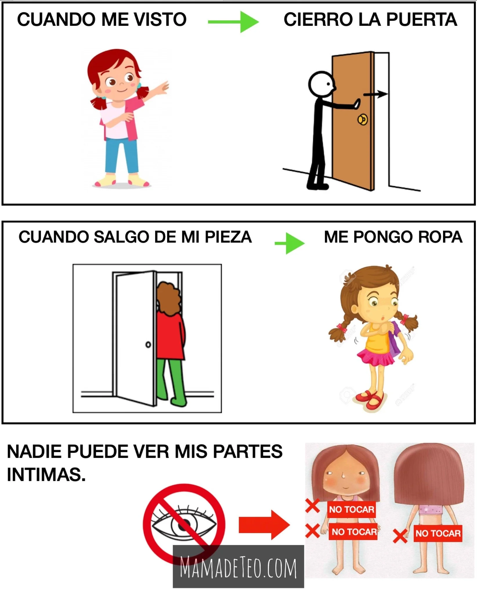 5- Otro punto muy importante que estamos implementando es el tema de la privacidad, entonces en su pieza le puse dos carteles con pictogramas recordándole que para vestirse tenemos que cerrar la puerta, que nadie puede ver nuestras partes intimas y que no puede salir de su pieza sin ropa.