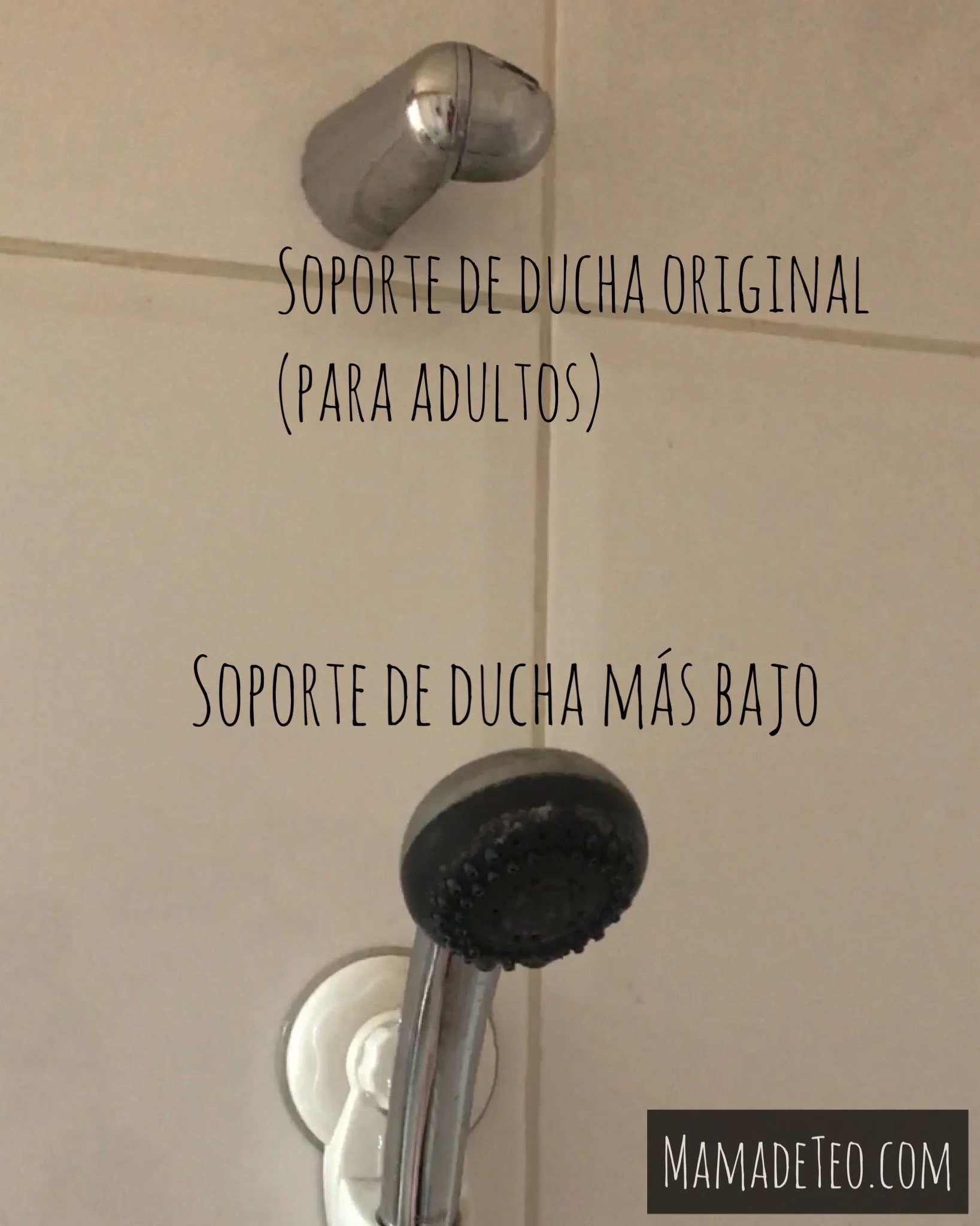 2- A la ducha le pusimos un adaptador para que esté más baja, así no le salpica tanto en agua en la cara (algo que aún le molesta).