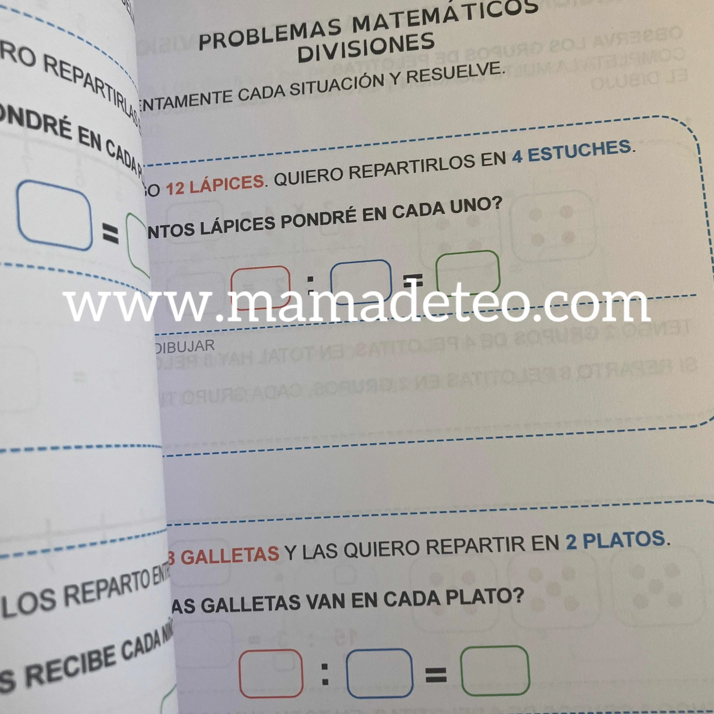 - Ejercicios visuales de división, usando casilleros, grupos y rectas numéricas.